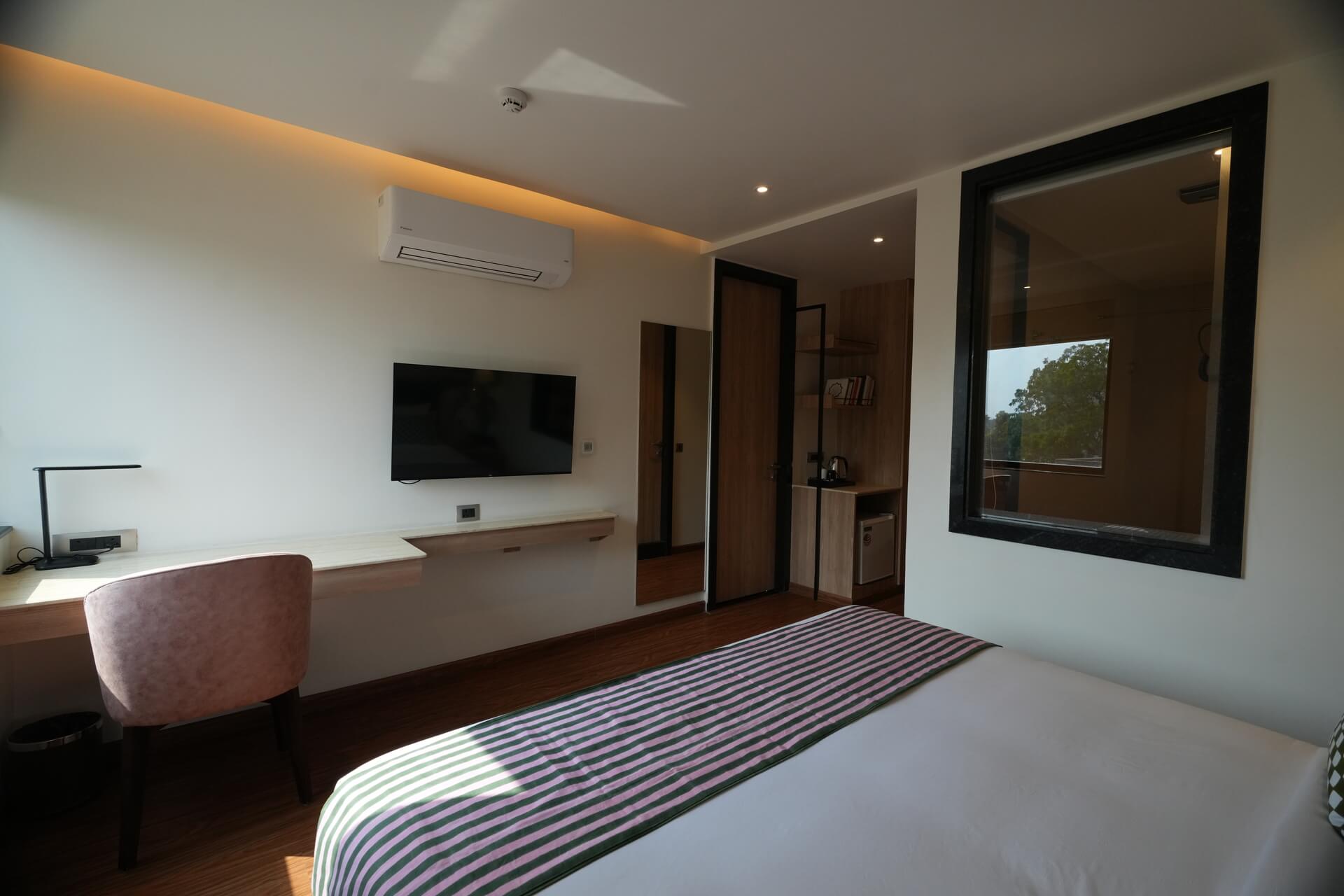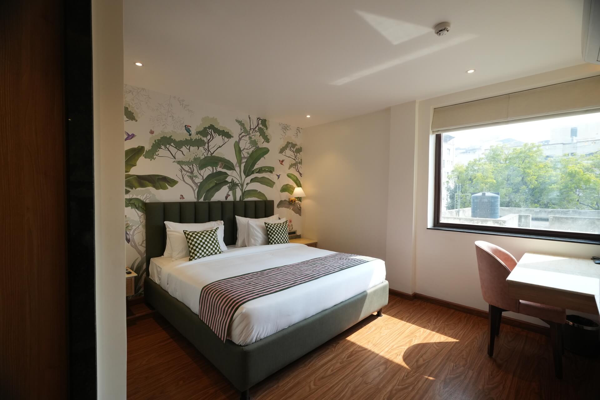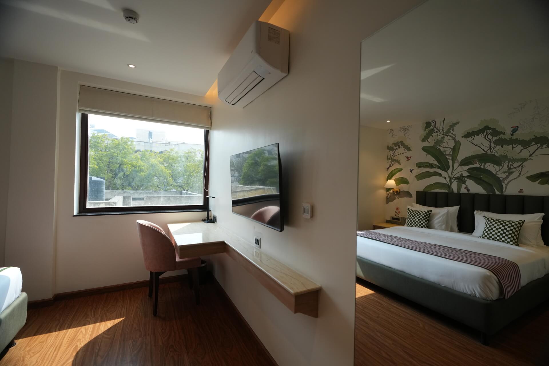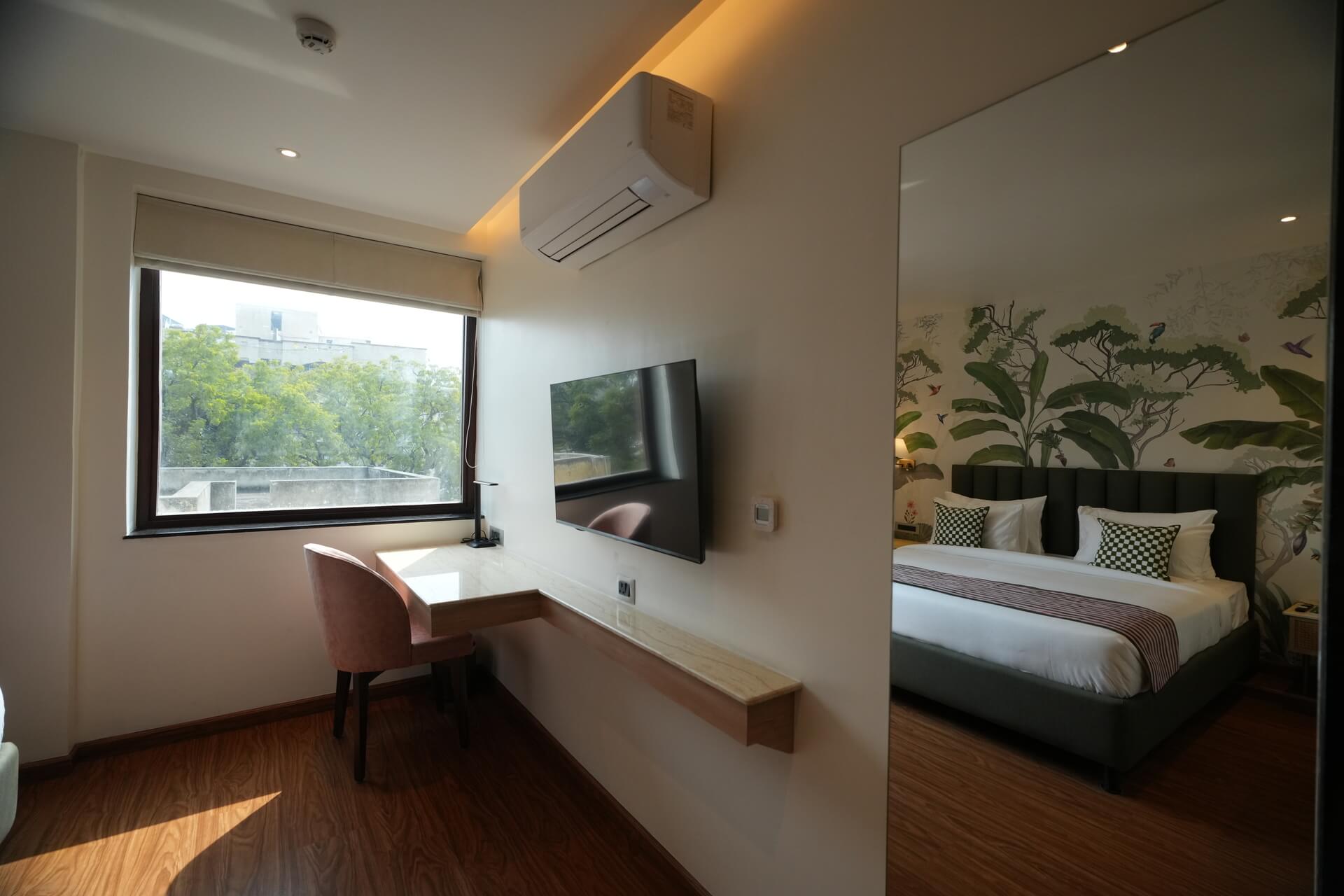 The LIV Deluxe Rooms are designed to unwind in this room featuring a LIV King Bed with a spacious bathroom with a desk and windows overlooking the city. Sophisticated details such as spc wooden floors create a residential comfort, while modern bath amenities and artistic integration invite guests to relax in style. City view rooms offer a stunning view of the city of Jaipur.