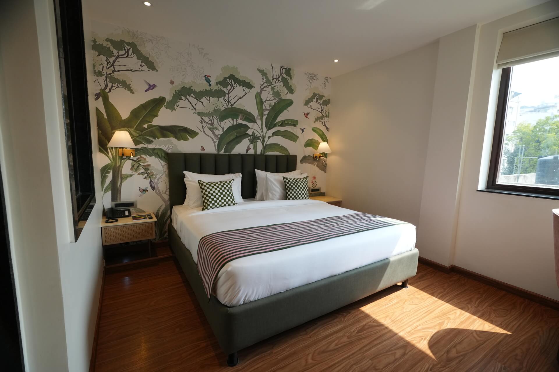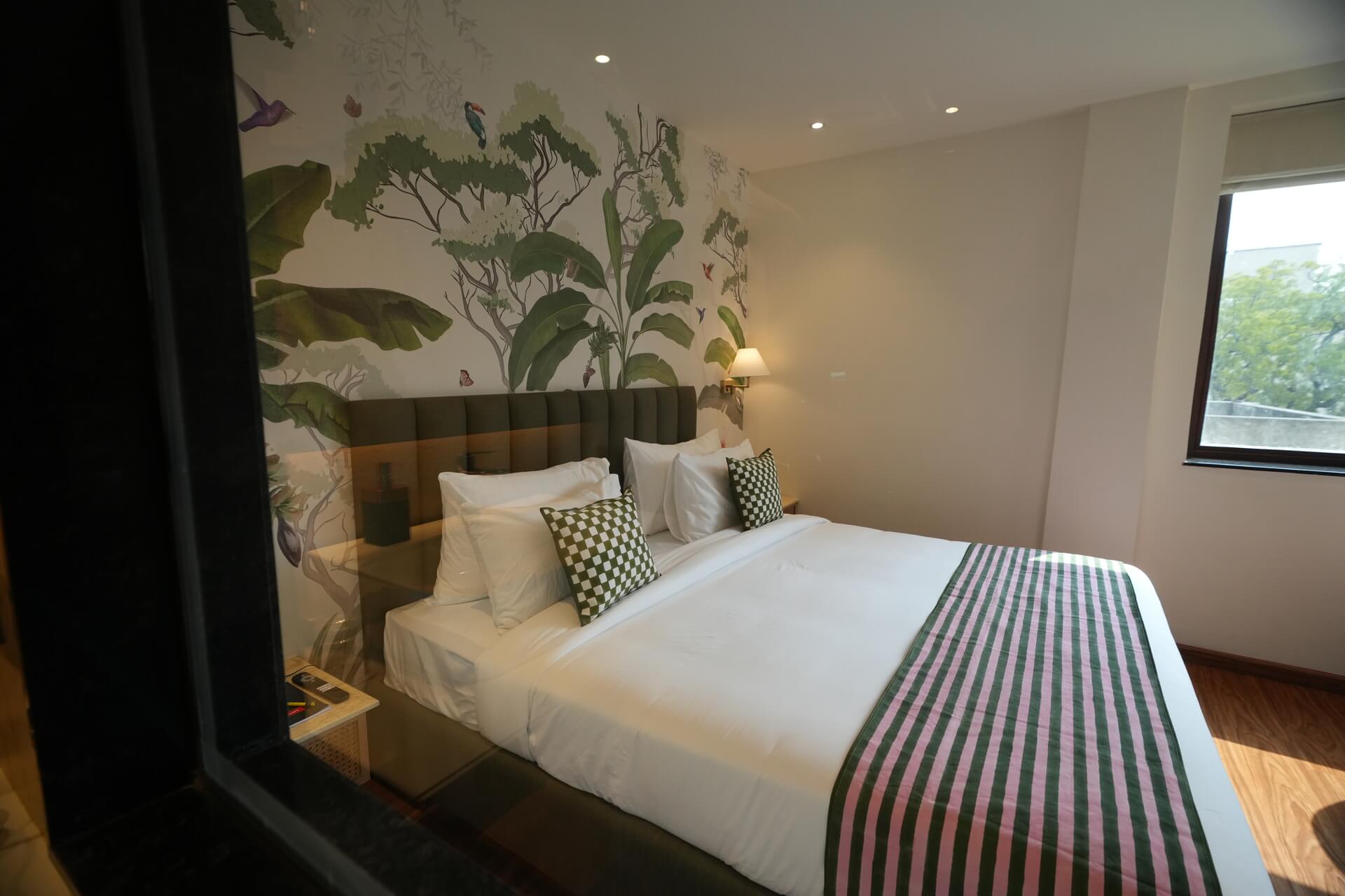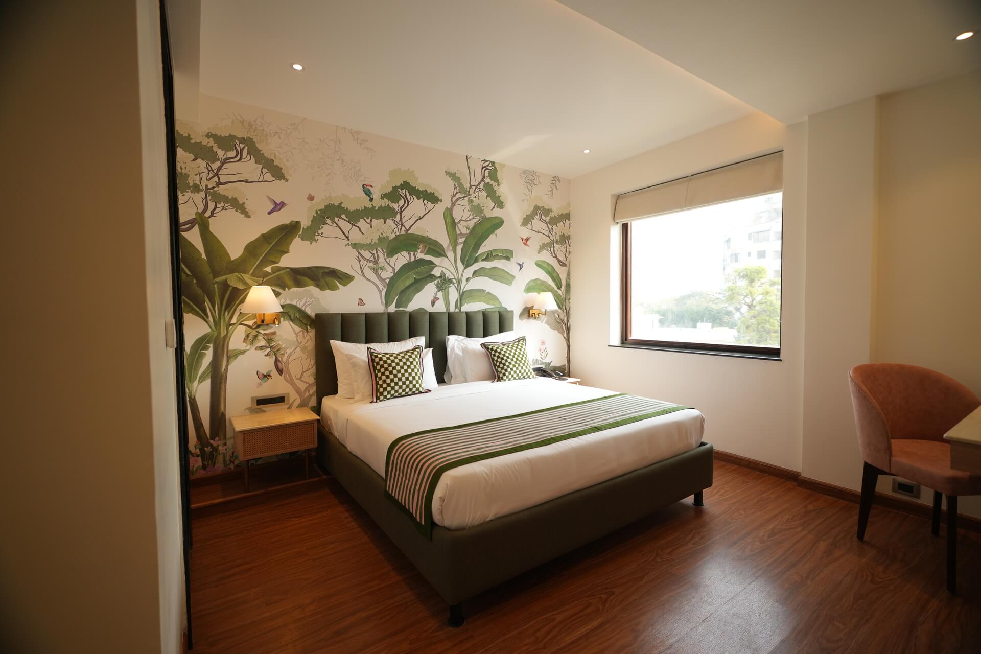 The LIV Deluxe Rooms are designed to unwind in this room featuring a LIV King Bed with a spacious bathroom with a desk and windows overlooking the city. Sophisticated details such as spc wooden floors create a residential comfort, while modern bath amenities and artistic integration invite guests to relax in style. City view rooms offer a stunning view of the city of Jaipur.