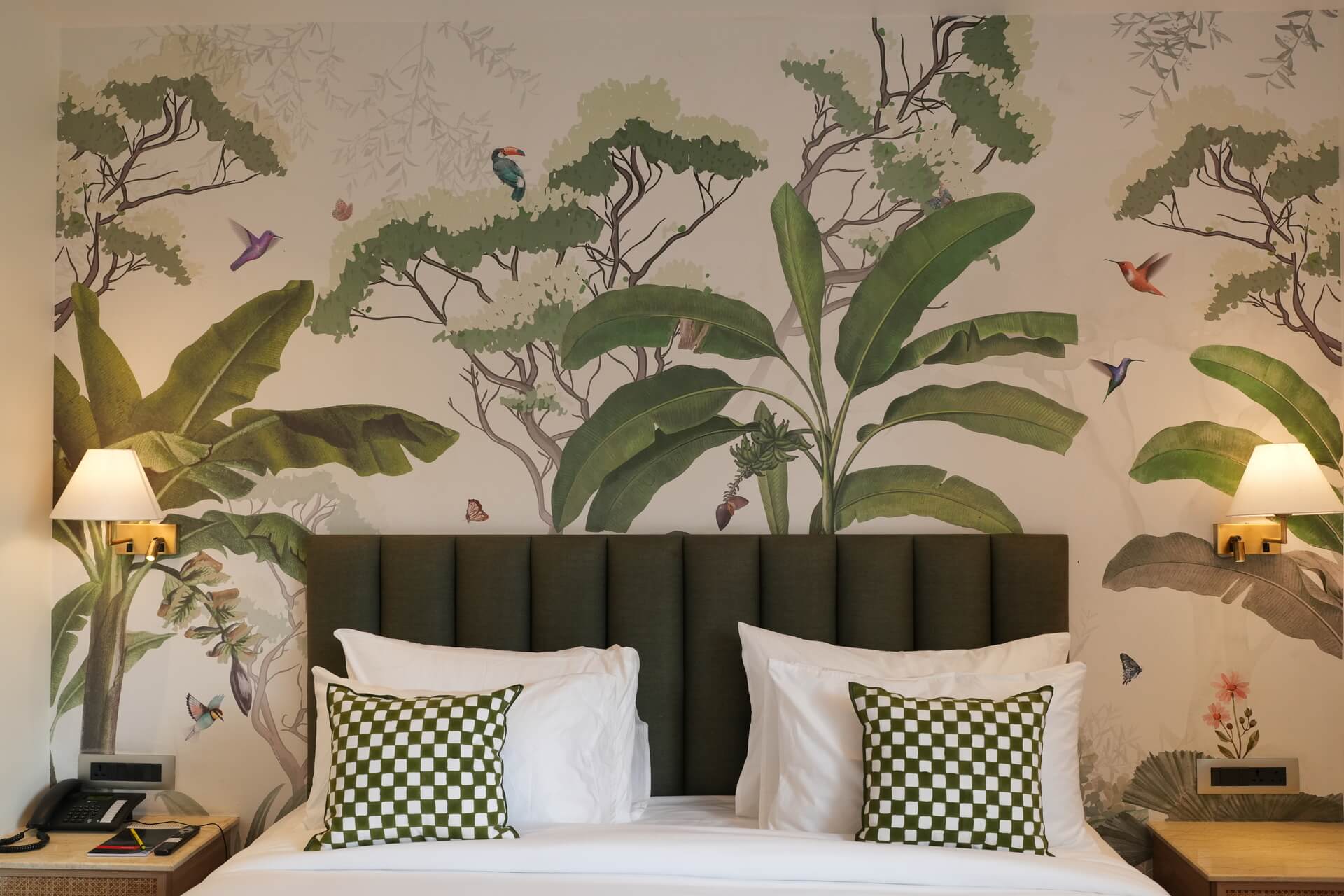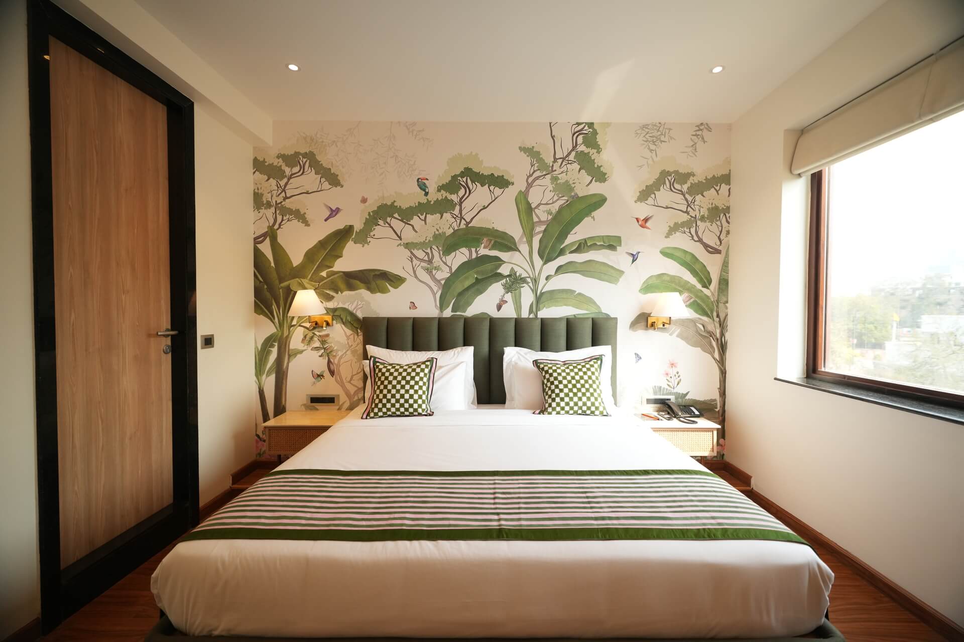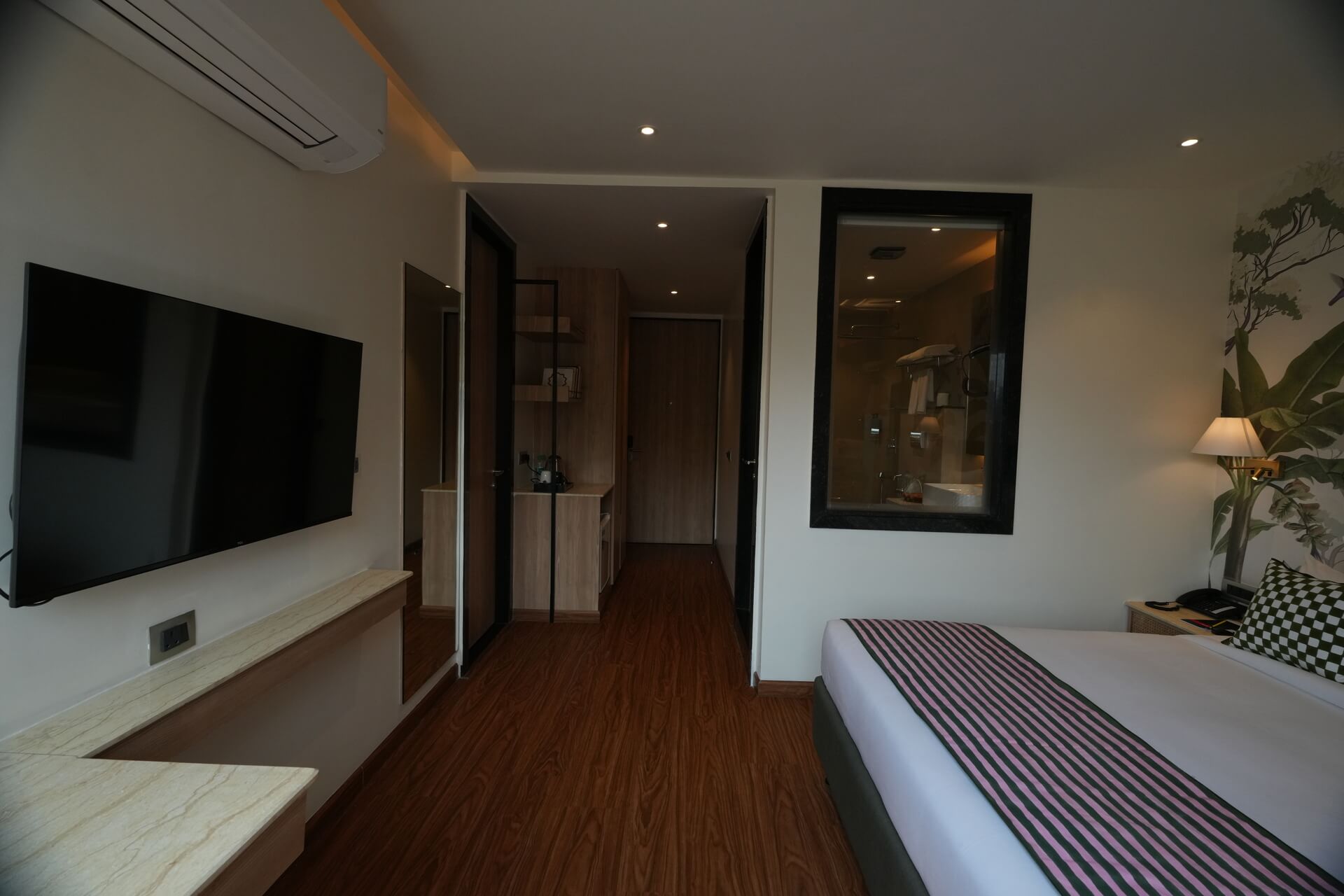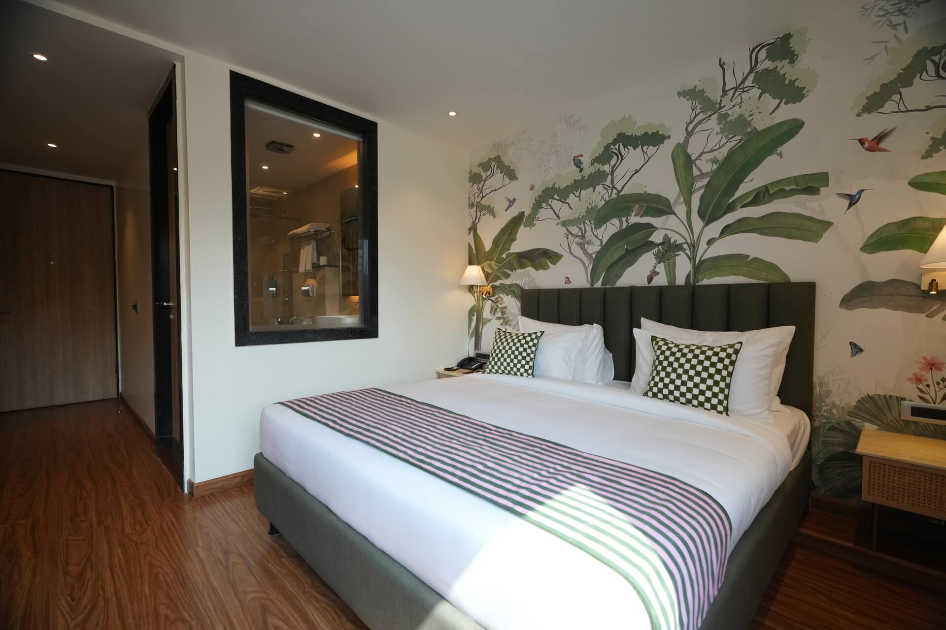 The LIV Deluxe Rooms are designed to unwind in this room featuring a LIV King Bed with a spacious bathroom with a desk and windows overlooking the city. Sophisticated details such as spc wooden floors create a residential comfort, while modern bath amenities and artistic integration invite guests to relax in style. City view rooms offer a stunning view of the city of Jaipur.